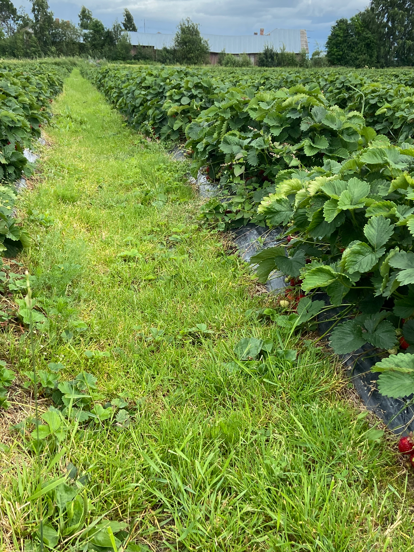 Opastamme pellolla poimisen alkuun. Mansikkapenkkien välit pyrimme pitämään siisteinä ja leikkaamme ne ruohonleikkureilla.